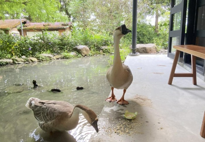 明星動物: 溫馴的山羊、毛茸茸的兔子(超可愛!)、體型不大的麝香豬、還有優雅的鴨子和鵝在水塘邊。