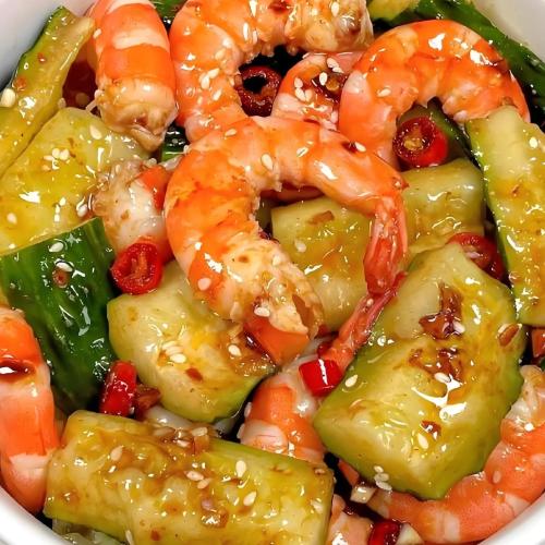 材料:蝦仁200克,青瓜1根,辣椒圈、白芝麻、生抽、香醋、香油、鹽各適量。