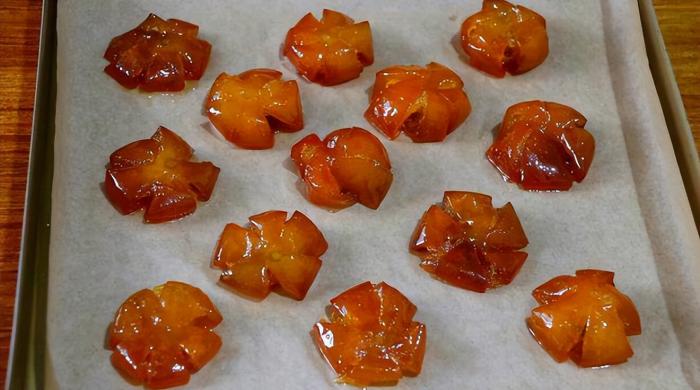 6:將煮好的金桔,平鋪在烤盤中,烤到金桔表面變得乾乾的;