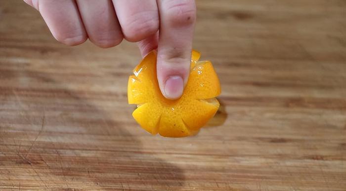 2:用刀在金桔表面劃上幾道小口,方便金桔更好的入味,把切好的金桔壓扁,摳出裡面的籽備用;
