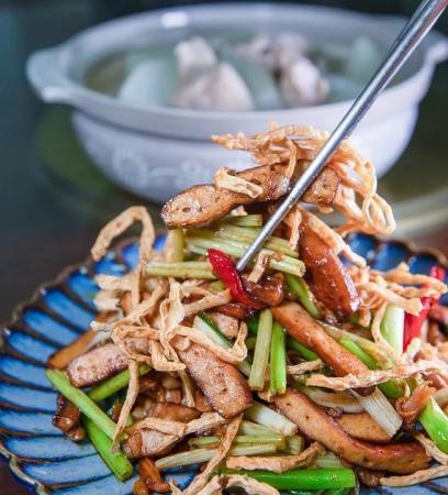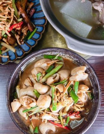 提到客家料理怎能沒有薑絲大腸,除了傳統的鹹、酸、甜外,惜緣亭還加入了豆豉的元素,讓整體的香氣有了更多的層次,不管是鹹還是香,另外添了少許的微辣,比之一般的薑絲大腸操下飯,還多了一點大火的鍋氣和淡淡的焦香,難得的是大腸的口感及皮下的油甜度都保持的很好,不會有過老咬不動的問題,