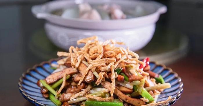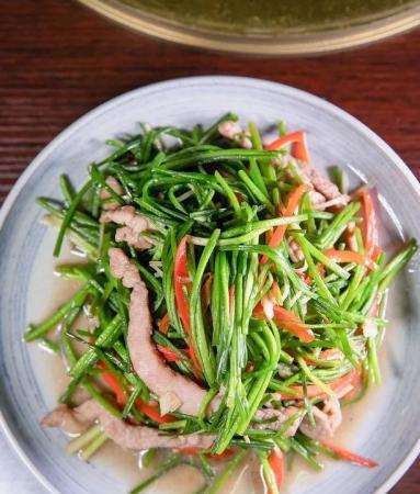 水蓮炒肉絲,水蓮爽脆帶點肉香油甜。