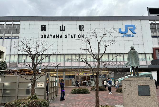 岡山火車站是中國地區的主要交通樞紐,在此乘坐新幹線可以往東(北)去新大阪、東京等地;也可往西(南)去廣島、福岡(博多)等地。除此之外,山陽本縣、瀨戶內海線等在此輸送旅客南來北往、東去西行。昨日和兒子去牛仔褲一條街,便是從這換乘瀨戶內海線到兒島的。