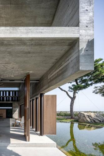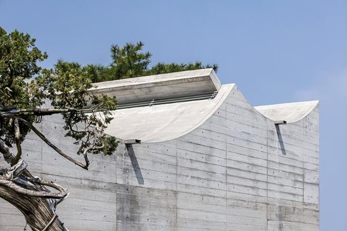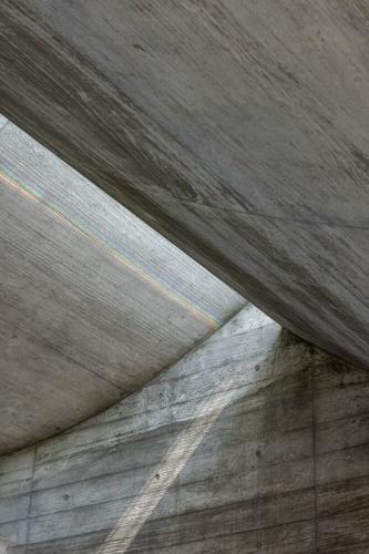 “水月茶館”亭位於山區,完全暴露在南方的陽光和東北的強風中。考慮到這一點,這種做法在展館的頂部加裝了兩塊交錯的、朝南的、彎曲的混凝土板,這有助於控制氣流並將宜人的南風引入室內。Behet Bondzio Lin建築師事務所寫道:“兩個弧形板和覆蓋前平臺的水平混凝土板之間的垂直錯位,讓太陽光進入空間,在寒冷的季節照射茶几的表面”。