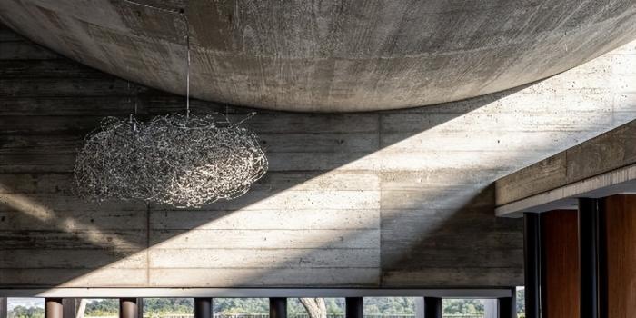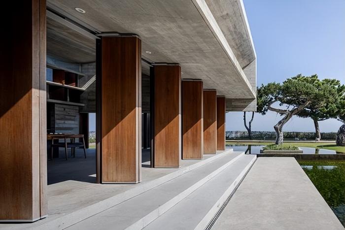 與鋼筋混凝土結構相得益彰的是北立面上的三角形緬甸柚木格子,擋住了從東北吹來的不利強風。同時,旋轉門也由緬甸柚木製成,位於計劃的周邊,有助於控制陽光並將氣流引導到主要休息空間。