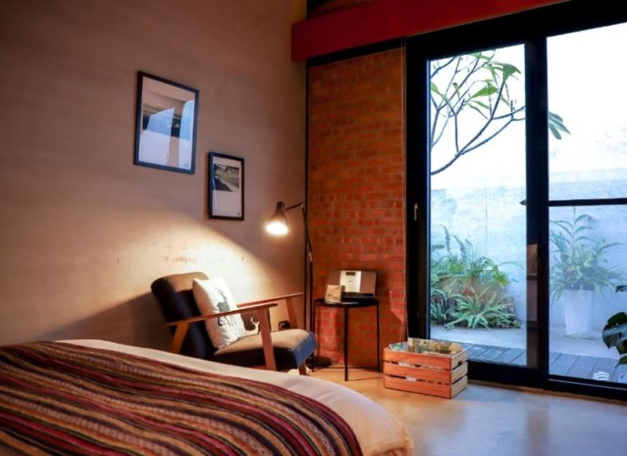 老屋改建超有味道!水泥牆混搭漂流木,文青感爆棚。頂樓泡腳池邊泡邊看星星超Chill。BUT!隔音真的普普,淺眠的人要三思。